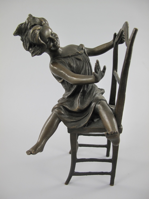 Diese dekorative bronzene Statue zeigt ein kleines hampelndes Mädchen auf einem Stuhl. Und obwohl sie sich an der Rückenlehne festhält, nutzt sie ihre Arme und Beine zum Ausbalancieren. Die Figur könnte das perfekte Geschenk für einen dekorations-bewussten Zappelphillip sein.
