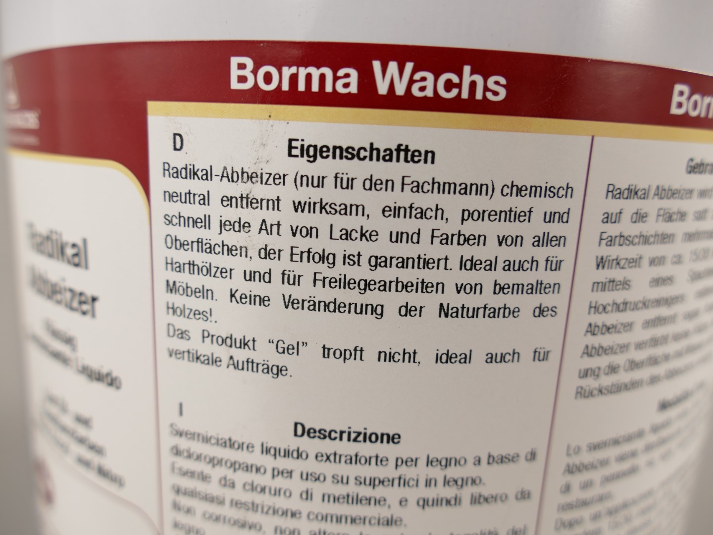 Entfernt wirksam, porentief und schnell jede Art von Lacken und Farben von jeglicher Oberfläche. Der Erfolg ist garantiert. Auch für Harthölzer geeignet, da der Borma Radikal-Abbeizer frei von Säuren und Laugen ist. Keine Veränderung der Naturfarbe des Holzes! Einfach einstreichen, ca. 1-2 Stunden warten und dann mit Spachtel oder rauer Bürste die alten Farbschichten entfernen. Anschließend mit nassem Schwamm abwaschen und nach dem Trocknen mit Borma Ethylalkohol reinigen. Die Dickflüssigkeit erleichtert das Arbeiten an vertikalen Oberflächen.