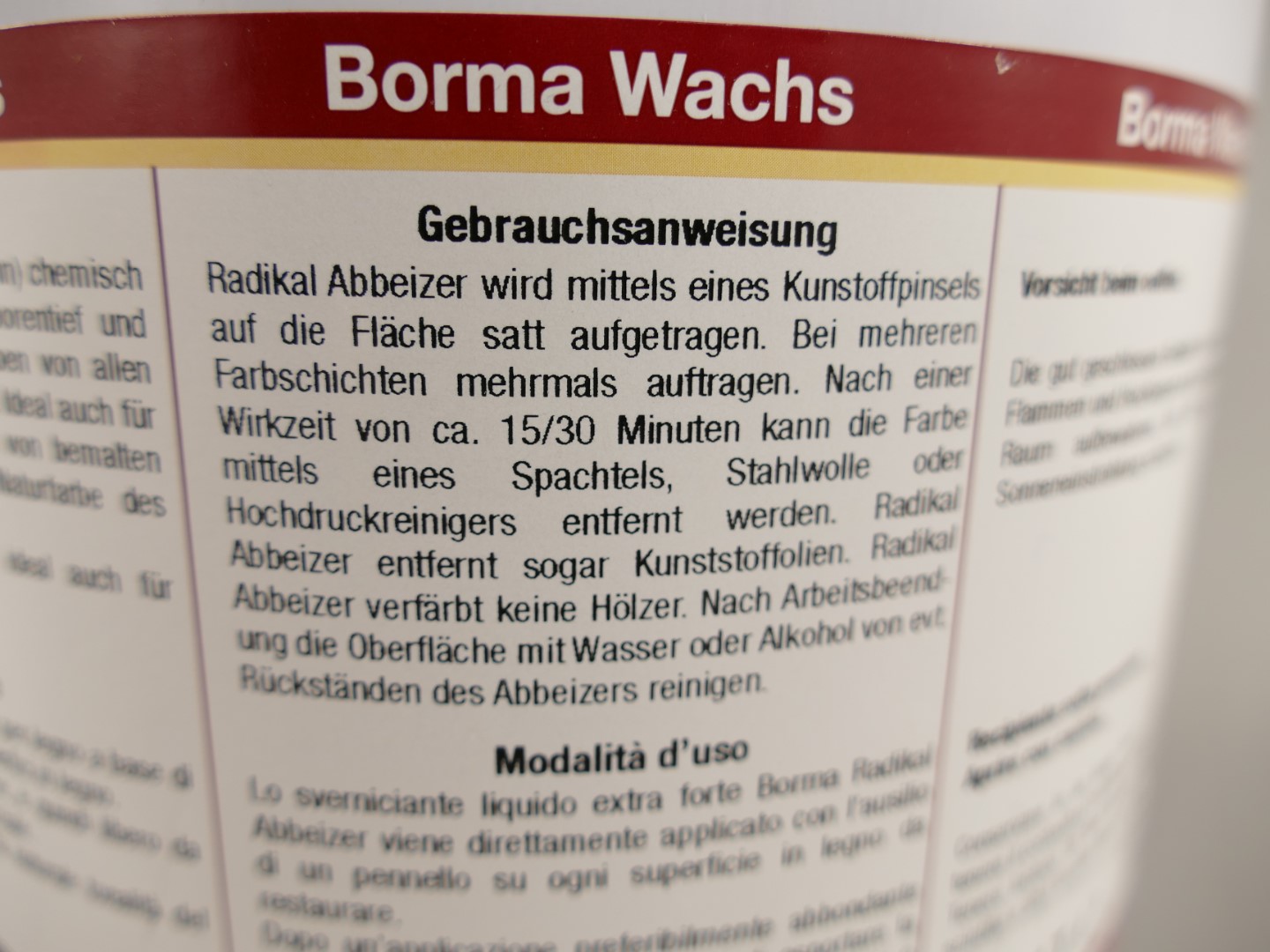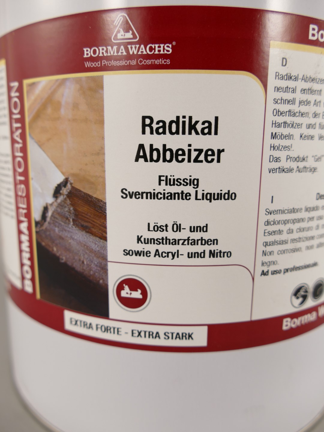 Entfernt wirksam, porentief und schnell jede Art von Lacken und Farben von jeglicher Oberfläche. Der Erfolg ist garantiert. Auch für Harthölzer geeignet, da der Borma Radikal-Abbeizer frei von Säuren und Laugen ist. Keine Veränderung der Naturfarbe des Holzes! Einfach einstreichen, ca. 1-2 Stunden warten und dann mit Spachtel oder rauer Bürste die alten Farbschichten entfernen. Anschließend mit nassem Schwamm abwaschen und nach dem Trocknen mit Borma Ethylalkohol reinigen. Die Dickflüssigkeit erleichtert das Arbeiten an vertikalen Oberflächen.
